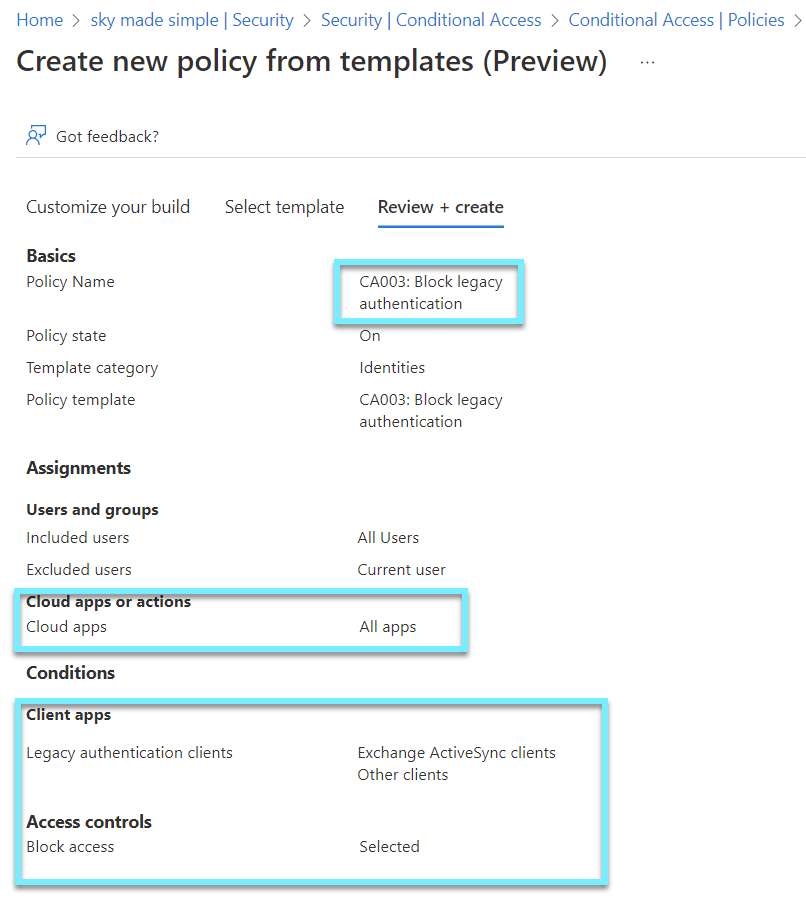 ⚠️The best way to protect your environment is to block legacy/basic authentication and instead use the new authentication standards that come with Primary Refresh Token (PRT). By turning off legacy authentication, we turn on Modern Authentication by default, since we sign in to our SaaS apps with Azure AD. We can quickly stop legacy authentication by using the Conditional Access templates. Just be careful and set it to report only if you need an overview first.