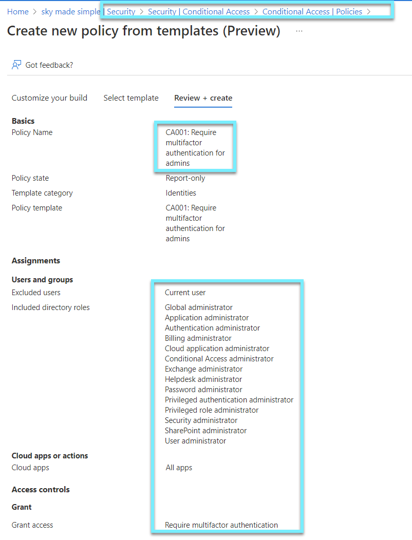 To enable MFA for administrative roles, create a Conditional Access from the template library. Run your policies in report-only mode to see the impact.