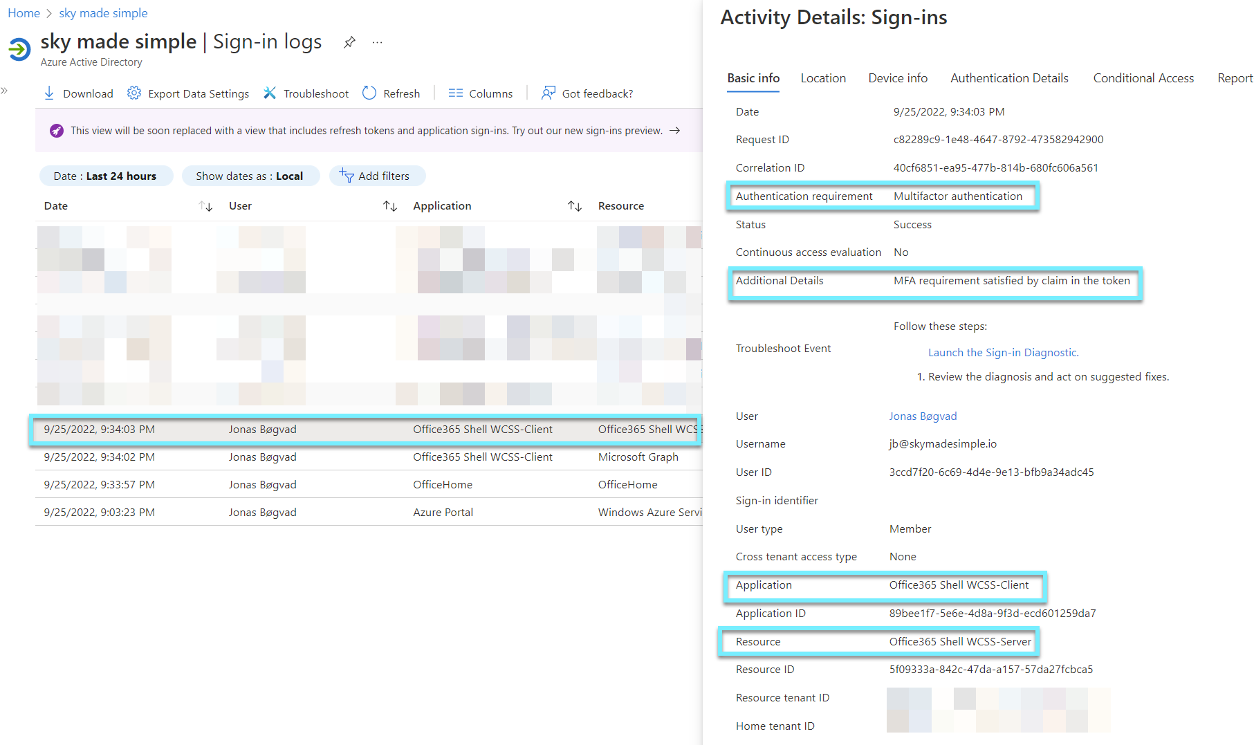 If we add the column resource, we will be able to see which application I communicated with, which is OfficeHome and Office365 Shell WCSS-Client. These are the "front end" applications that we see on our screen and with which our sign-in communicates to gain access to the resources.