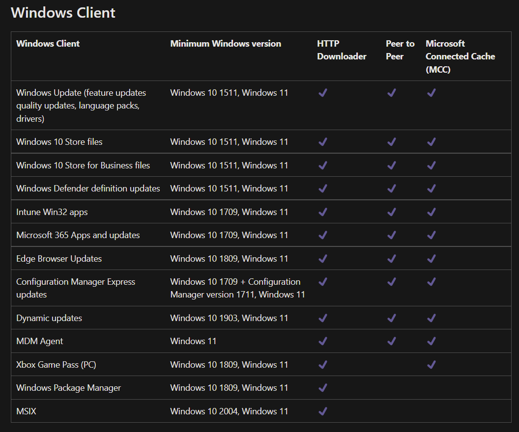 The table below shows which Windows clients are compatible with Delivery optimization.