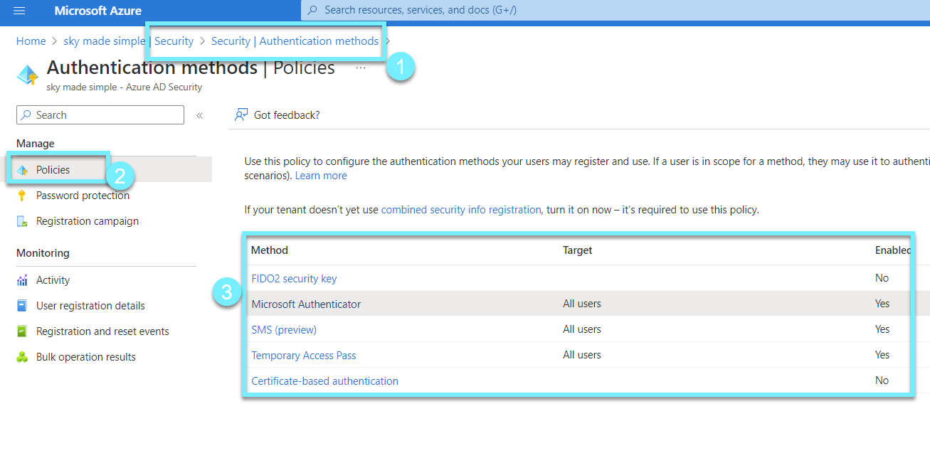 Let's head on over to our beloved Security department in Azure AD, in here we can manage our security in Azure AD. What we are going to work with in this posts is the new 🆕 authentication methods.