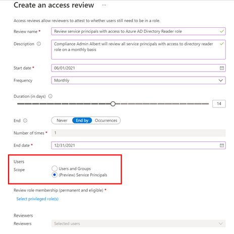 - Review service principals and applications that are assigned to privileged directory roles in Azure AD using access reviews for service principals.