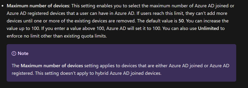Users may join devices to Azure AD(Never, because we are Azure AD Registered)- Maximum number of devices per user in Azure AD (Yes, user context)