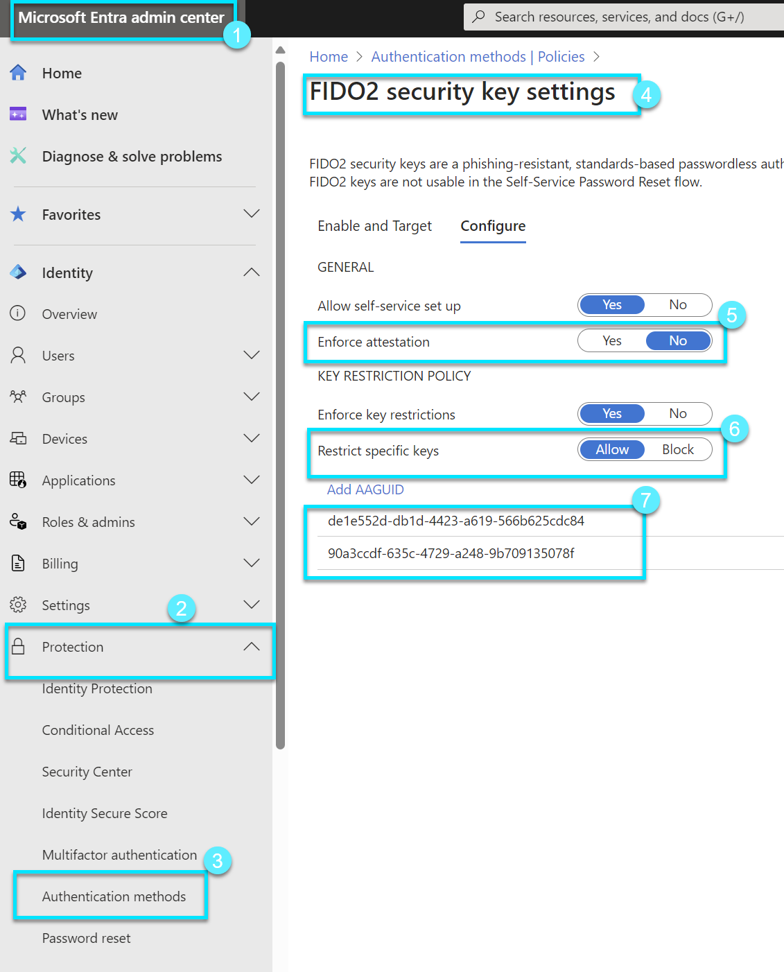 - Enforce Attestation should be set to "Yes" if your organization wants assurance that a FIDO2 security key model or passkey provider is genuine and comes from a legitimate vendor.